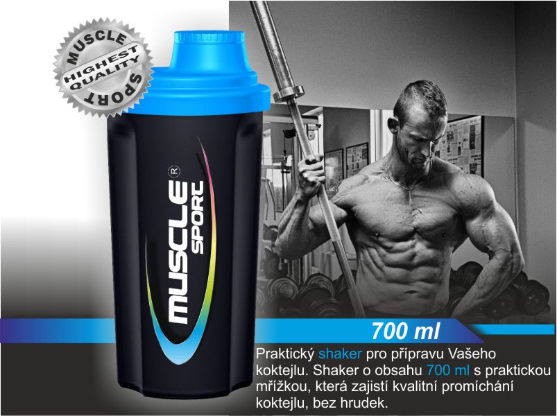 Praktický šejkr s dobře těsnícím uzávěrem. Díky kvalitně vyřešenému uzavírání obsah neprotéká. Víčko šejkru je modré barvy a vlastní uzávěr má barvu též modrou. Je šroubovací. Po straně je logo MUSCLESPORT a rysky na odměření. Uvnitř šejkru je mřížka pro lepší promíchání.